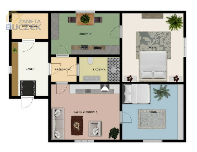 -przedpokój oraz dodatkowe pomieszczenia gospodarcze takie jak kotłownia i ganek.