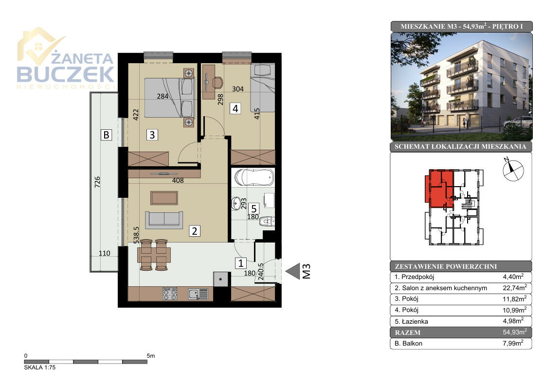 - Układ: salon z aneksem kuchennym, dwie sypialnie, przedpokój, łazienka
