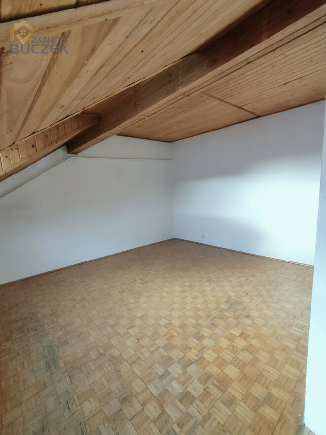 Układ pomieszczeń: 3 pokoje, salon z miejscem na kuchnię, łazienka, osobne WC, korytarz oraz poddasze.
