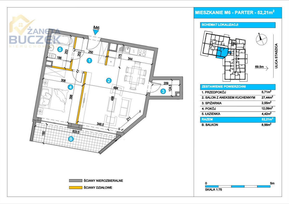 Powierzchnia mieszkania wynosi 52,21 m2 i składa się z: