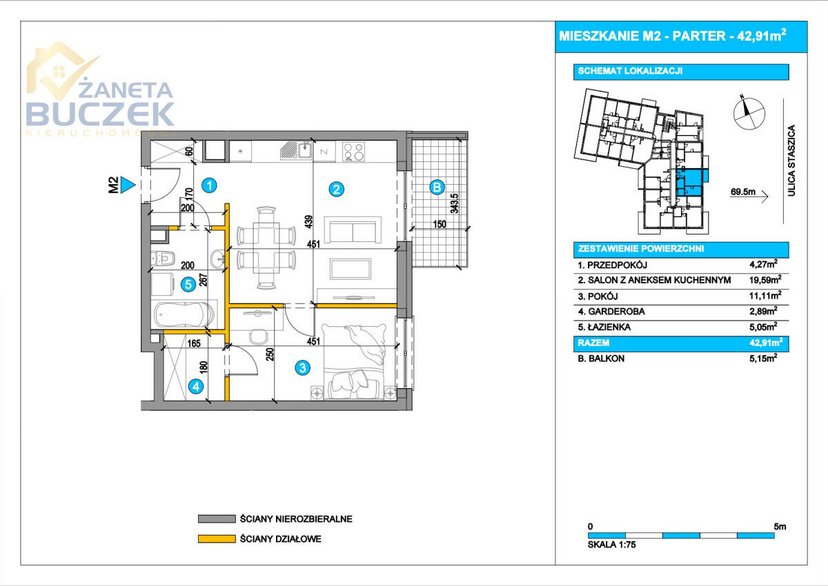 Powierzchnia mieszkania wynosi 42,91 m2 i składa się z: